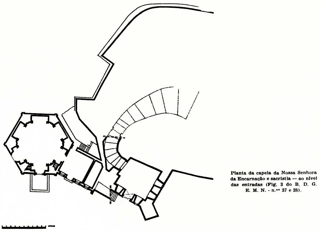 c) está ladeada, pelo sul, pela sacristia que tem um andar onde vive o guarda, casa que antigamente era conhecida pela «do capelão»;