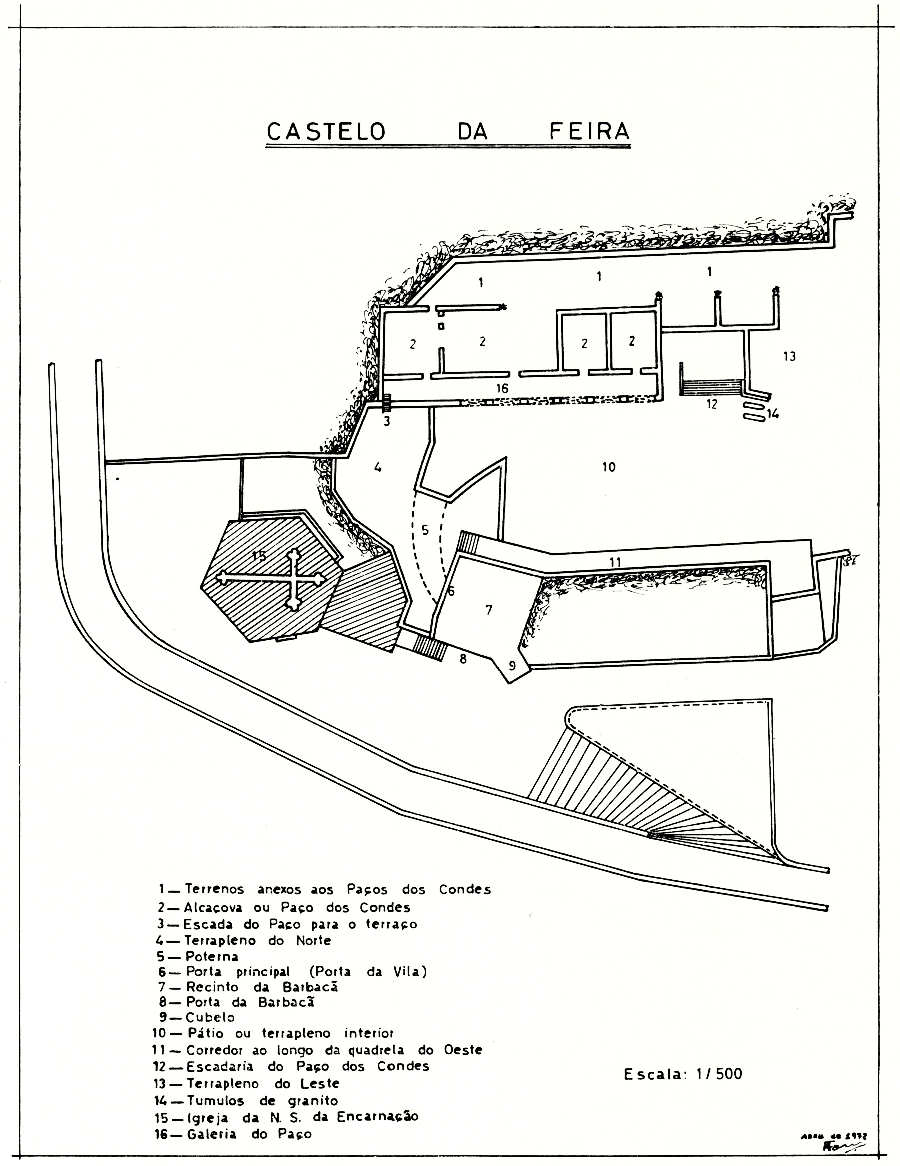 «= 25.º – Um castelo, construido todo a granito, denominado «Castelo da Feira» cuja notícia mais remota vem do século XI. É de tipo ogival constituido por uma torre de menagem quadrangular e flanqueado por cubelos terminados por coberturas de formas cónicas.