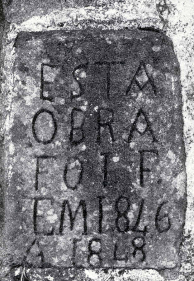No muro exterior, que separa o adro do terreno público que lhe fica para poente, ao lado direito das escadas que dão acesso àquele segundo plano do adro, há uma inscrição que diz = Esta Obra Foi F. Em 1846 a 1848.