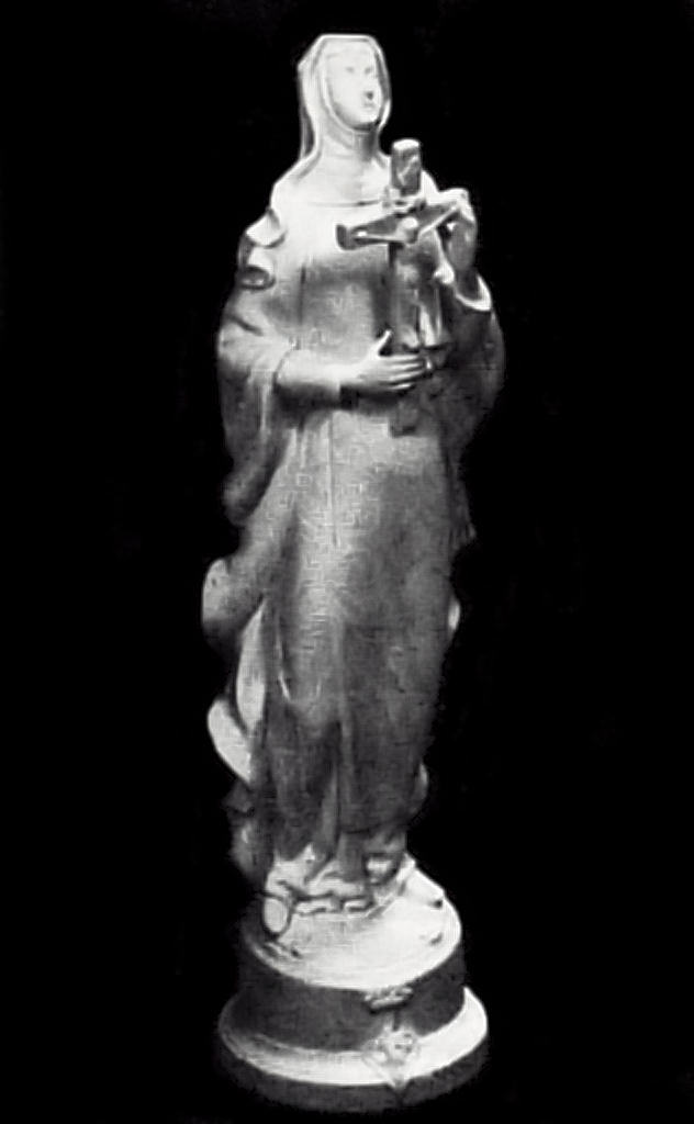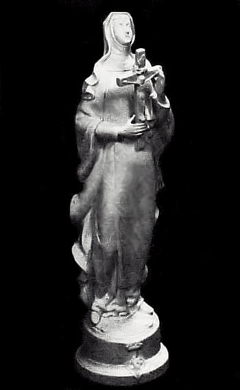 de Santa Joana, vestida de hábito dominicano, com o crucifixo e coroa de
