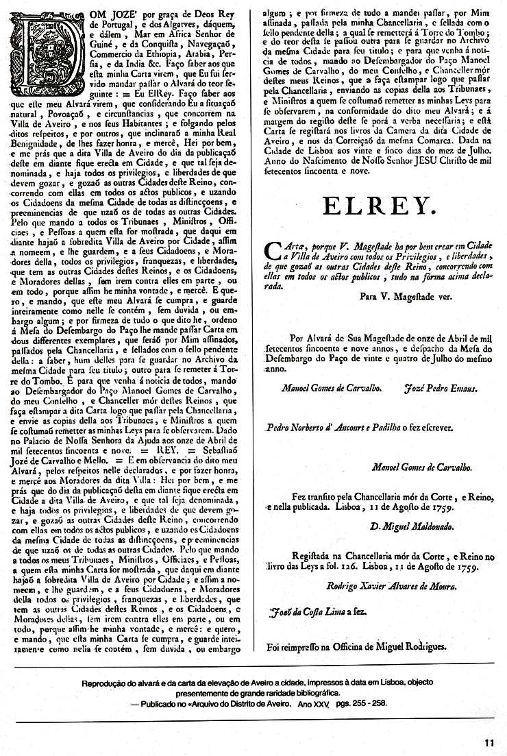 de cidade: – «Hei por bem e me apraz que a dita vila de Aveiro, do dia
