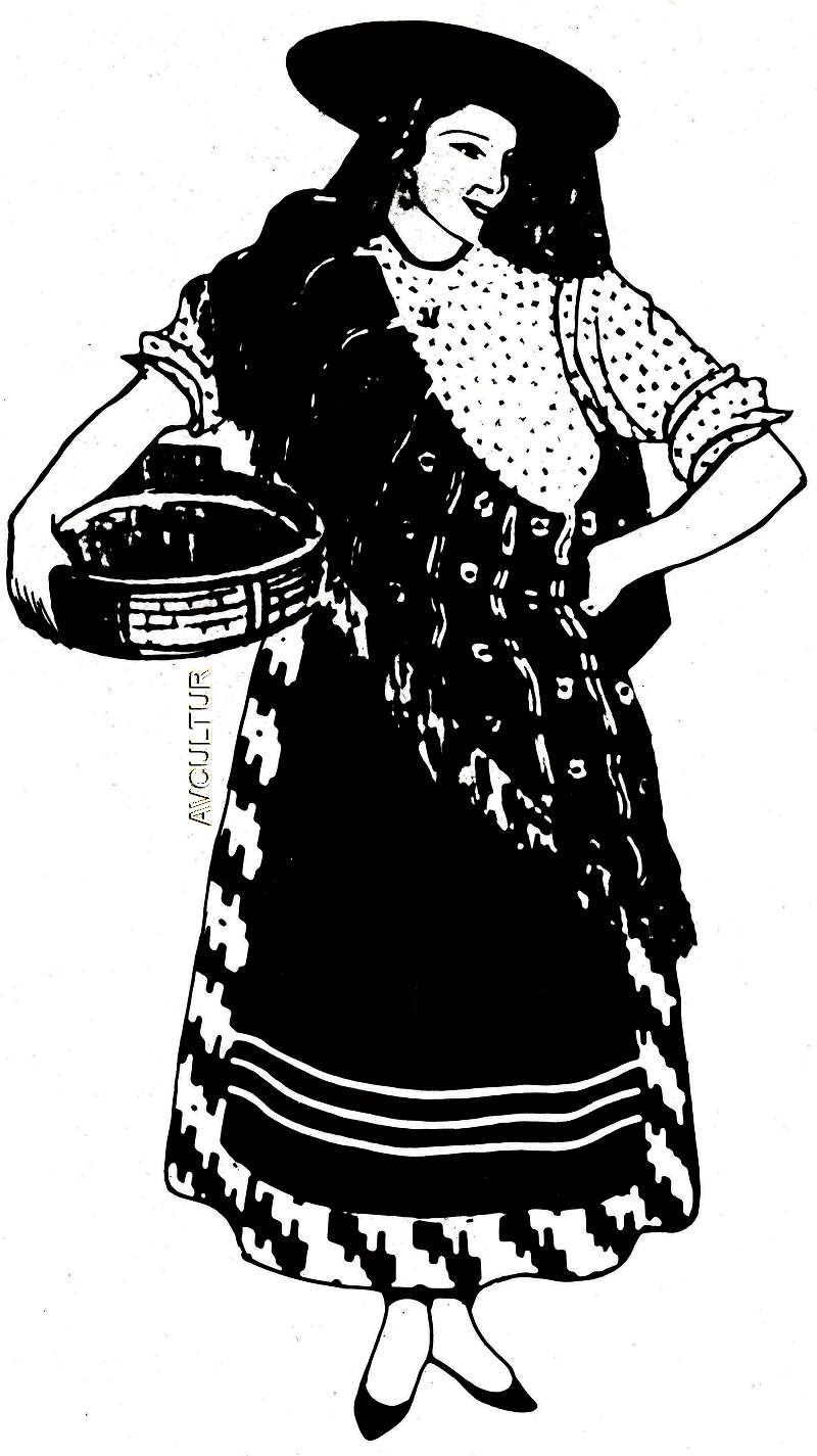 de saias rodadas, de blusas bordadas e lenços coloridos ou negros,