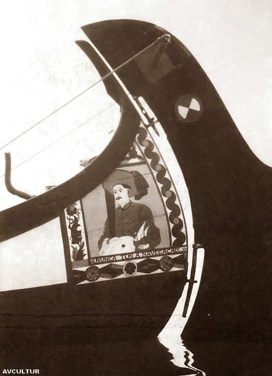 proa ostenta geralmente as figuras de um monarca ou de um cavaleiro; num