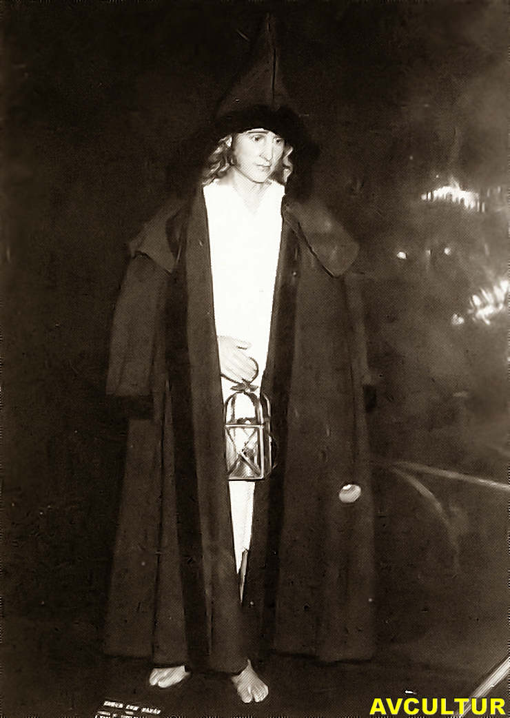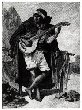 burel ou de pano negro, enfaixado por uma cinta e usando barrete, cuja