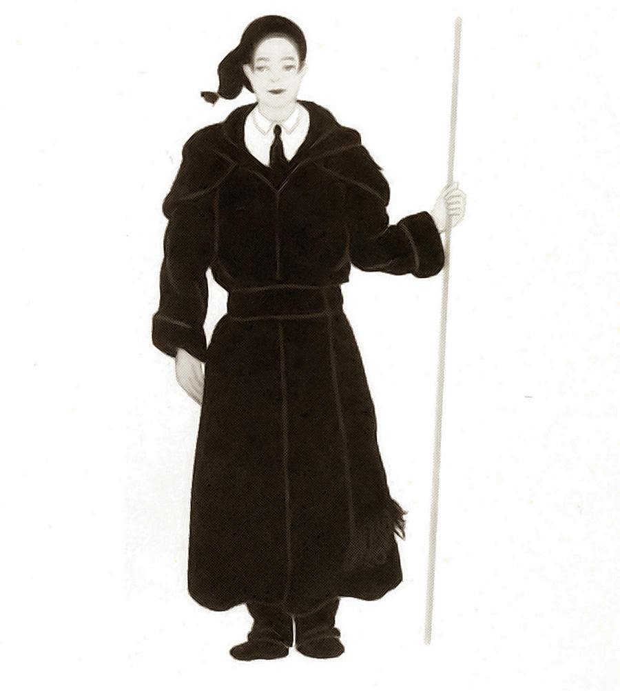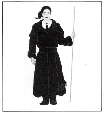 sapatos pretos, luvas brancas e opa de seda escarlate, aconchegada à