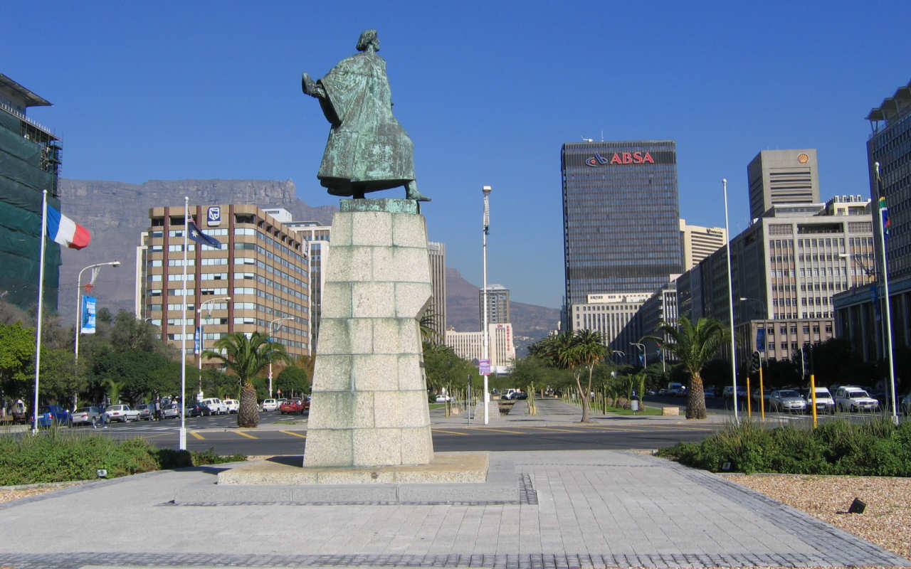 Estátua de Bartolomeu Dias em Cape Town, na África do Sul. Ao fundo,