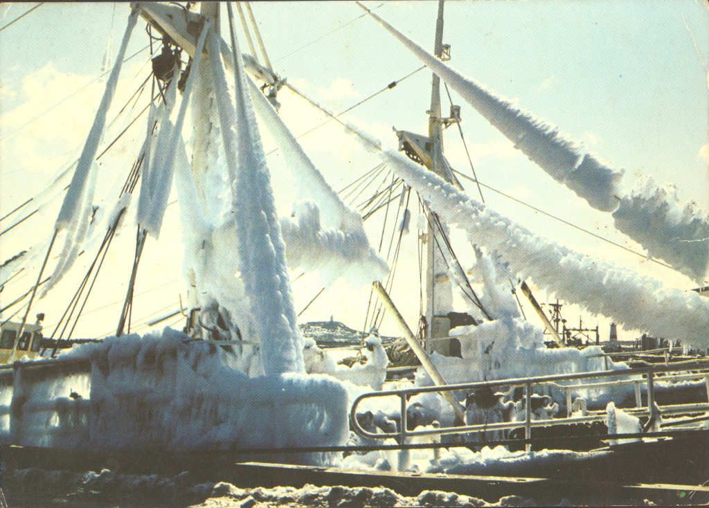 Barcos cobertos de gelo no porto de Saint-Pierre. Consultar o link relativo a BARCOS.