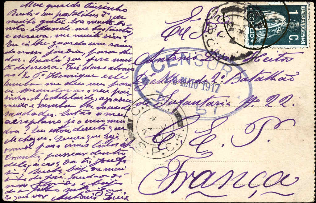 6 - O postal anterior, com o carimbo da censura (16 Maio 1917).