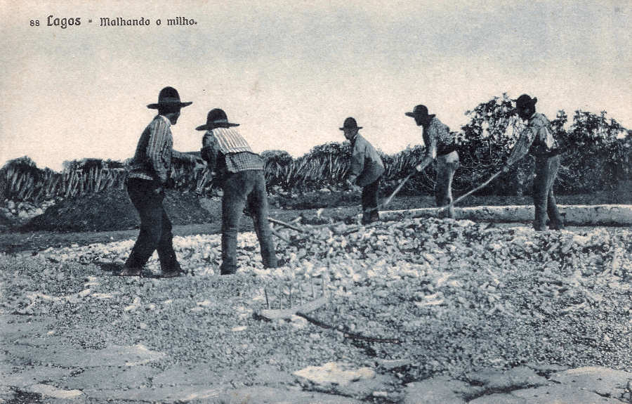 Nº 88 - Lagos. Malhando o milho - Edição e cliché de António C. dos Santos, Lagos - SD - Dim. 14x9 cm. - Col. M. Chaby (cerca de 1920)
