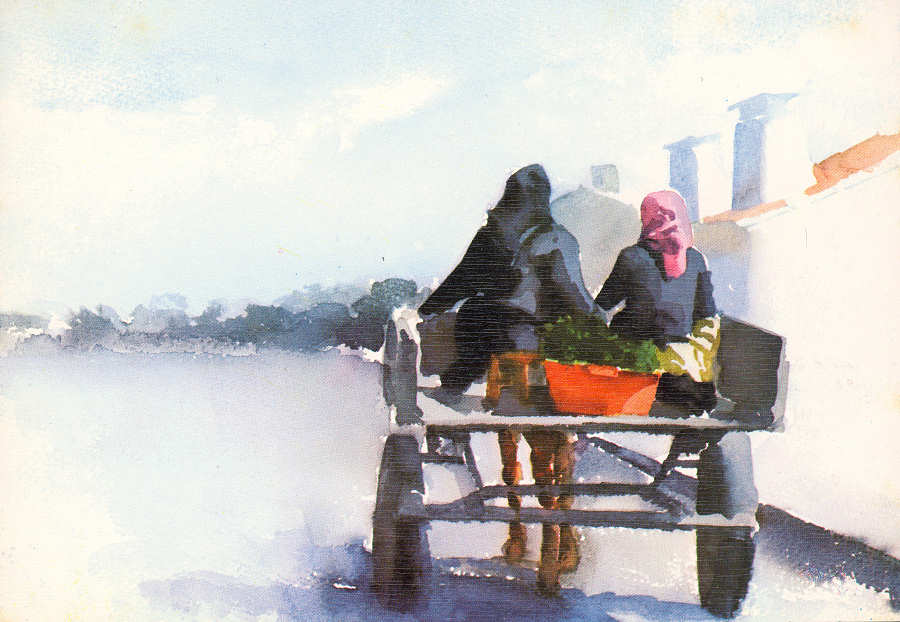 S/N - Carroça-Ribatejo. Aguarela 0,32x0,27, 1985. Paulo Ossião - Edição da Galeria "A GRADE", Aveiro - S/D - Dimensões: 15x10,5 cm. - Col. Énio Semedo