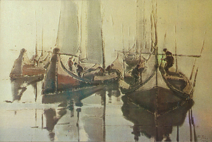 19 - Moliceiros. Aveiro. Óleo sobre madeira, 1985. Original de Cândido Teles.