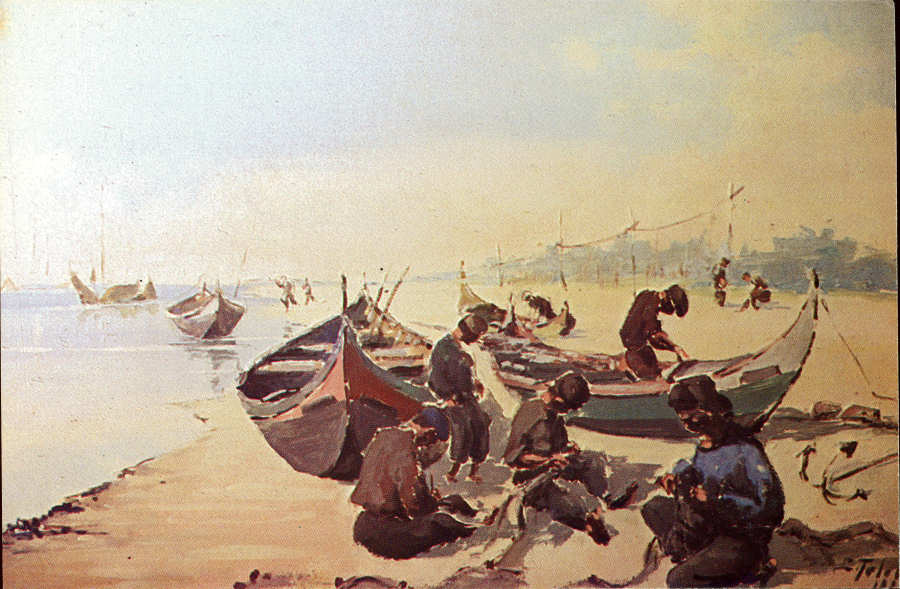 60. Pescadores da Ria de Aveiro. Óleo sobre madeira de Cândido Teles, 1982.