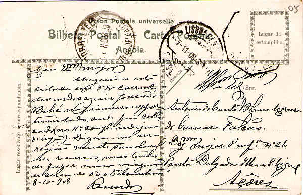 6. Nº 8. Benguella, Estação do cabo submarino. Edição da Collecção Tavares & Cia, Benguella. Dim. 138x89 mm. Carimbo Postal NOV1908. Col. A. Monge da Silva.  (verso)