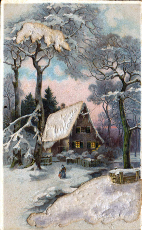 Postal alemão com colagens em papel de veludo branco circulado em