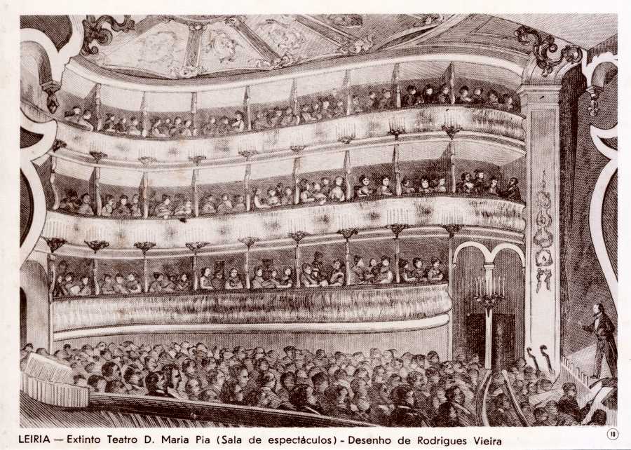 N.º 10 - LEIRIA-Teatro D. Maria Pia (sala de espectáculos)-Desenho de Rodrigues Vieira - Editor Comissão Cultural das Obras Sociais do Pessoal da Câmara Municipal de Leiria - Dimensões: !5x10 cm. - Col. R. Gaspar.