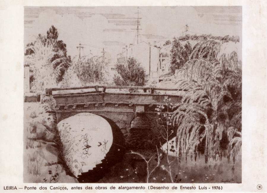N.º 16 - LEIRIA-Ponte dos Caniços antes das obras de alargamento (Desenho de Ernesto Luís, 1976) - Editor: Comissão Cultural das Obras Sociais da Câmara Municipal de Leiria - Dimensões: 15x10 cm. - Col. R. Gaspar.