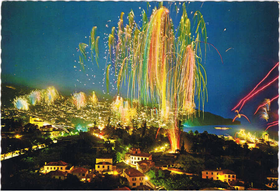 MAD 32 - FUNCHAL  (Madeira) O fogo da noite de S. Silvestre - Ed. Francisco Ribeiro - Rua Nova de S. Pedro,27 telef. 23930 FUNCHAL - MADEIRA - SD - Dim. 14,7x10,1 cm. - Col. Fátima e Manuel Bóia (1975).