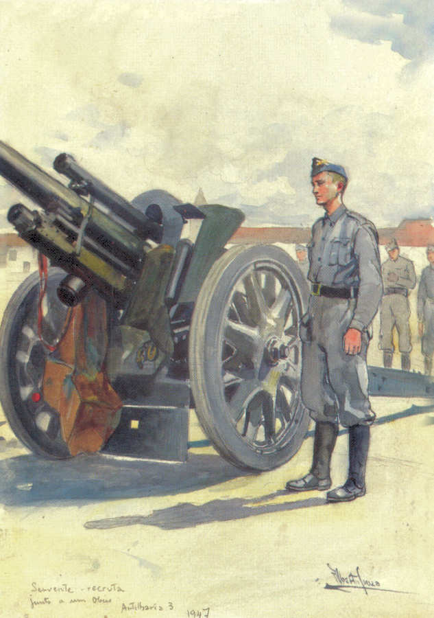 69. Servente Recruta junto a um obus; Artilharia 3 (1947).