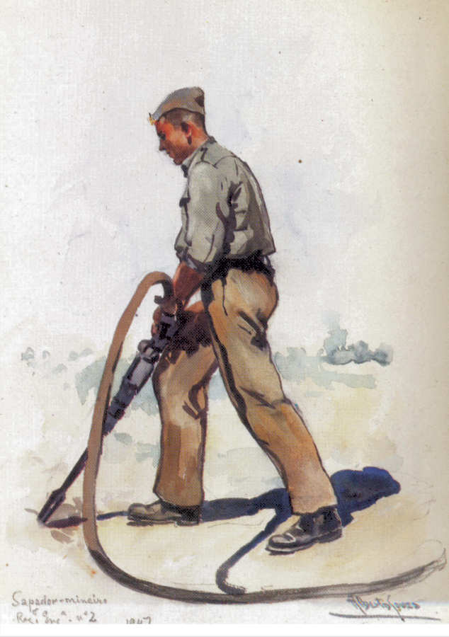 Nº 40 - Sapador mineiro do Regimento de Engenharia nº 2 (1947) - Edição Museu Militar, 1991 - Dim. 14,8x10,4 cm -  Aguarela de Alberto de Sousa - Col. Amílcar Monge da Silva