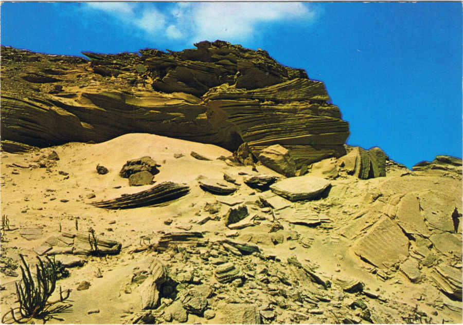 Nº 349 - PORTO SANTO Rochas talhadas pela erosão - Ed. BERNARDINO V.G. CARVÃO APARTAMENTOS PIORNAIS-BLOCO 9-3.ºA - FUNCHAL LITO OF. ARTISTAS REUNIDOS-PORTO - SD - Dim. 15x10,5 cm - Col. Manuel Bóia (1988).