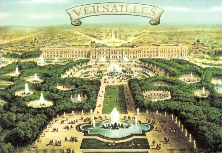 2 - Versailles: vue perspective de la place d'Armes en 1668, la cour de marbre, le parterre d'eau.