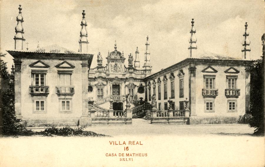 N.º 16 - Villa Real-Casa de Matheus. DXLVI - Edição da Pap. e Typ. Guedes & Saraiva, Aurea, 80-Portugal-Lisboa - S/D - Dimensões: 13,7x8,7 cm. - Col. Aurélio Dinis Marta. (Nota: Além de elementos gráficos e dos dizeres «Union Postale Universelle, Bilhete Postal», indica os valores das franquias na época: estampilha de 10 reis para Portugal, Hespanha e respectivas colónias; de 20 reis para o estangeiro)