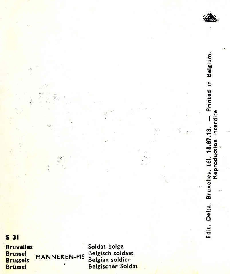 Nº S31 - Manneken Pis vestido de Soldado Belga - Edição Delta, Bruxelas - Dim. 15x10,5 cm - Col. A. Monge da Silva (c.1970)