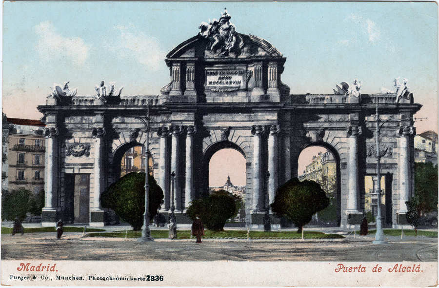 63.N.º 2836. MADRID. Puerta de Alcalá . Edição Purger & Co., Munchen, Photochromierkarte cerca de 1905. Dim. 140x90 mm. Colecção Amílcar Monge.  Verso