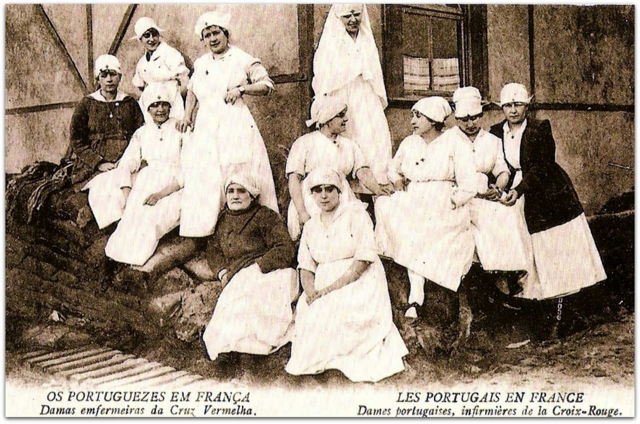 383. «Os Portugueses em França», Damas enfermeiras da Cruz Vermelha em França, (1ª Guerra Mundial). Foto de Arnaldo Garcez. Serviço Fotográfico do C.E.P., 1917. Dim. 138x88 mm. Col. Col. M.J. Dias.