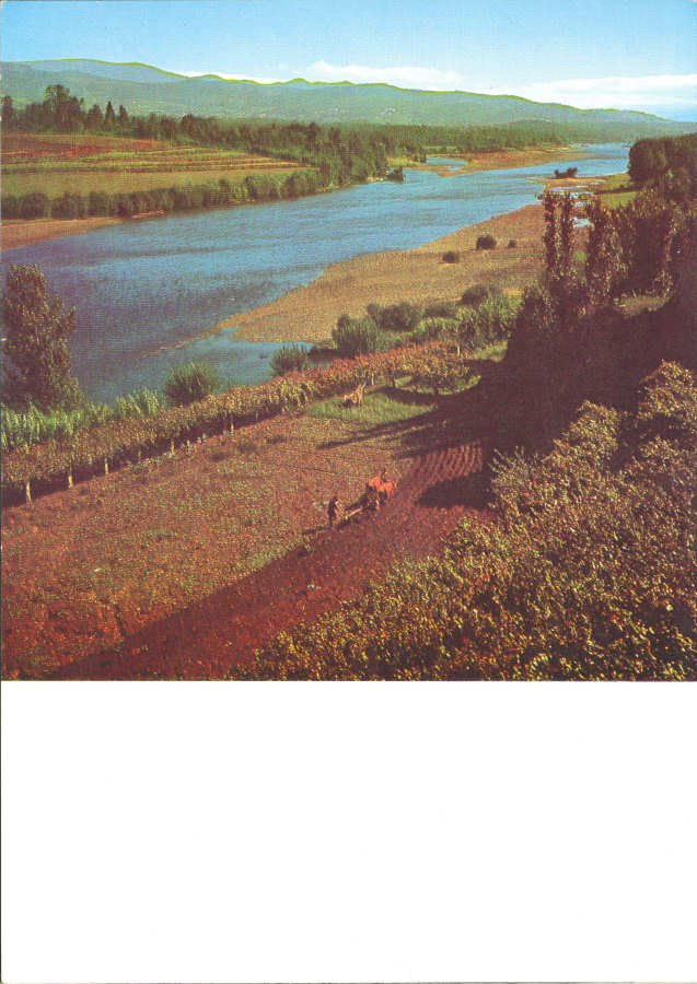 I RG 11 - MONÇÃO. Rio Minho em aguarela de Roque Gameiro - Edição dos CTT - Circulado em 1966 - Dim. 14,8x10,5 cm - Col. A. Monge da Silva