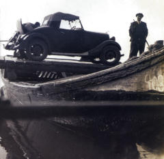 acoplados, rebocados por uma lancha para fazer a travessia de carros