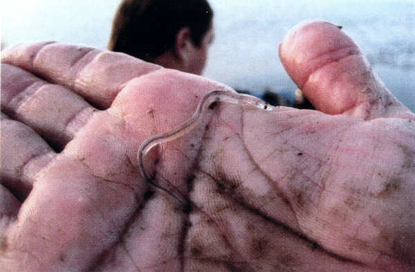 O meixão juvenil de enguia como chega às nossas águas, após as metamorfoses sofridas desde o Mar dos Sargaços onde nascem.