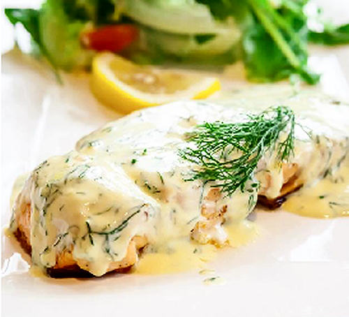 Quando o salmão estiver cozinhado, servir acompanhado com a salada