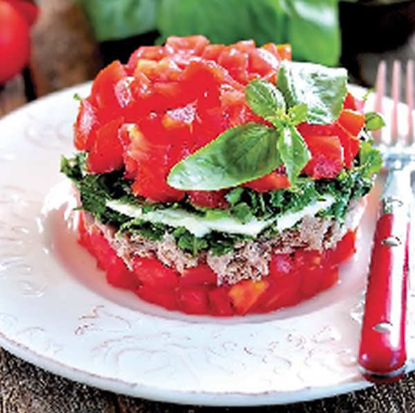 fatias por tomate. Monte, em cada prato, os mil-folhas da seguinte