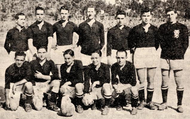 De pé e da esq.: Dr. Tavares de Matos (Presidente), Camilo, Manuel J. Santos, J. Silva, Aníbal Costa, João Carlos (orientador técnico), Teixeira,