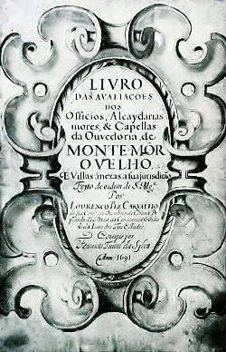 Entre esses livros, tive ocasião de ver o «Livro / das avaliações / dos I Officios, Alcaydarias / móres, & Capellas / da Ouvedoria de / Monte-Mor / O Velho, / E Villas
