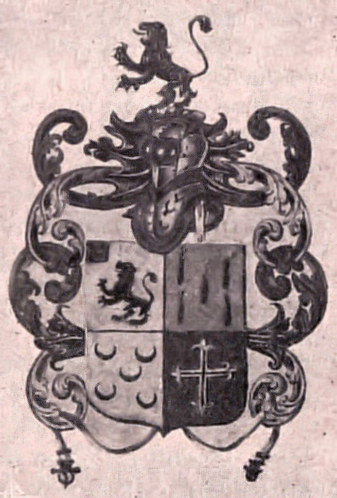 campo de prata sicoestre, digo sinco crescentes de lua vermelhas postas em sautor, no quarto as dos