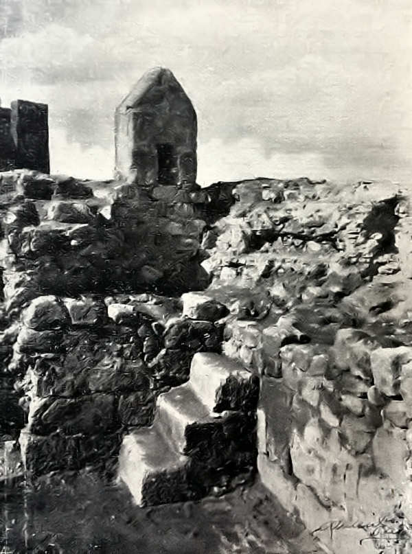 Estão já feitos esses tríplices cachorros, alteia-se o cubelo, já se completou a escada de caracol e vão pôr-se as guardas no poço e em volta da escada, para em seguida se refazer o parapeito coroado de ameias como a que se descobriu ao norte, marcando assim esse pedaço das fortificações uma época aproximada do século XII. Como este cubelo do poço fica na parte do monumento sobranceira à vila, dar-lhe-á um aspecto interessante / 274 / e característico, a marcar um estilo diferente do da torre onde se projecta, atestando logo que naquele complexo de muralhas se cumulam memórias de diversas eras e que as várias idades daquelas pedras se medem por séculos e até por milénios.