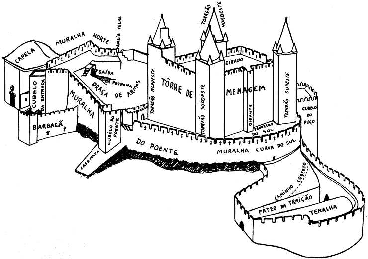 Para o sul da praça de armas, prolongam-se aos lados da torre de menagem estreitos terreiros que foram ambos alpendrados. O do poente tem a meio a entrada da rampa para a casamata e corre a par do parapeito da muralha coroado de merlões onde vinha assentar o telheiro. O do nascente tem ao fundo a porta ogivada do caminho coberto, que desce para o / 266 / pátio da traição, e junto dela o postigo lateral da torre já referido. O telheiro pendia duma ranhura cavada na parede da torre a pousar em pilares assentes num pequeno muro paralelo ao cubelo saliente para leste, onde existe um profundo poço servido por escada de caracol de 141 degraus. Abrem da escada para o poço oito altas janelas de arco redondo sobrepostas umas às outras. A escada e a parede das janelas pesam sobre um arco abatido, de granito, firme na rocha nativa a mais de trinta e três metros do nível do cubelo, escavando-se, portanto, mais de vinte metros abaixo do solo adjacente. Entre dois dos pilares do alpendre começa o patim da escada que comunica com o adarve vindo do sul pelo nascente e com o cubelo do poço, subindo para o terrapleno ao leste e sul da torre, que vai ligar ao terreiro do poente e é fechado em toda a volta pelo adarve, recto ao leste e curvo ao sul, que, em dez socalcos, sobe e desce sempre coroado de merlões com besteiras cruciformes e respectivas troneiras circulares.