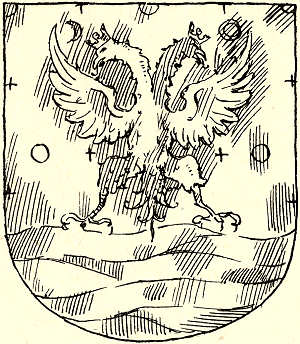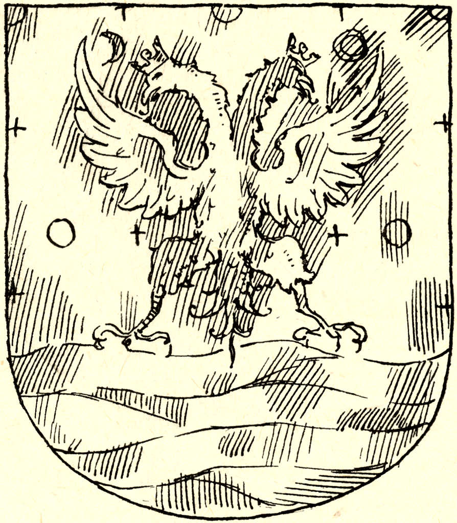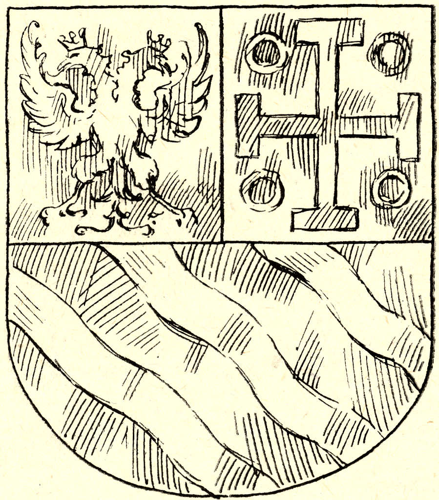 duas cabeças de prata, coroadas de oiro partido de azul, cruz de oiro
