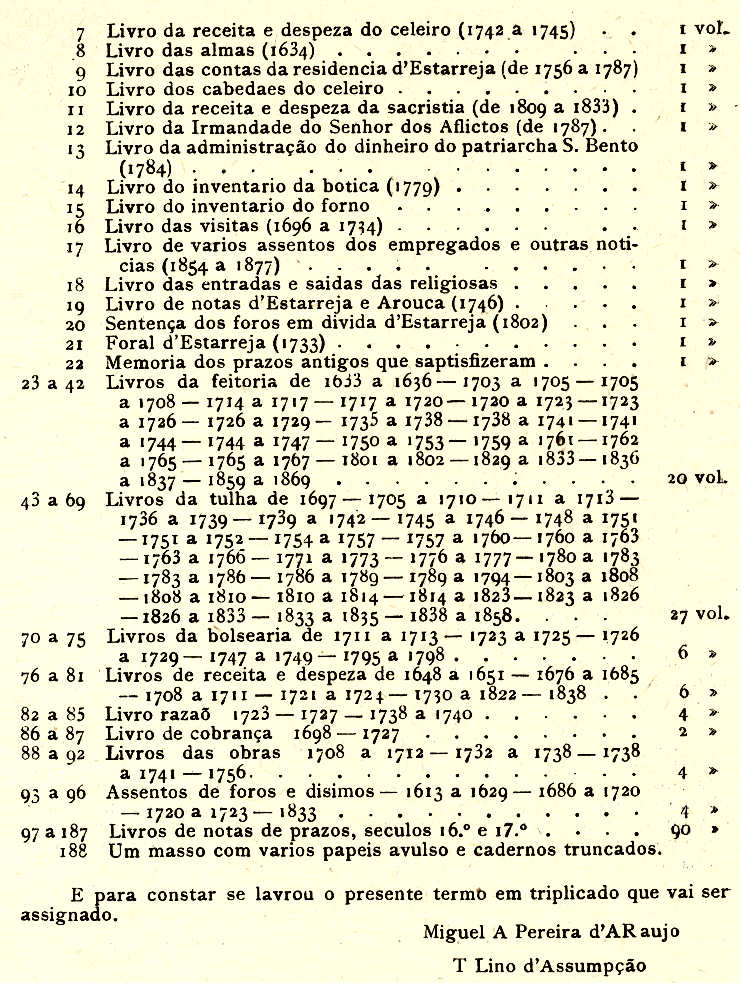 A seguir à incorporação dos pergaminhos que documentámos com o recibo passado por AUGUSTO SOROMENHO, de 1858, inserimos a relação dos manuscritos levados em 1896 para a Inspecção das Bibliotecas e Arquivos por LINO DA ASSUNÇÃO − documento pertencente hoje ao Arquivo da Universidade de Coimbra que o recolheu com os papéis avulsos da Direcção de Finanças do Distrito de Aveiro em 1937 − já que não dispomos da relação dos livros que anteriormente José Manuel da Costa Basto fez recolher de Arouca à Torre do Tombo.