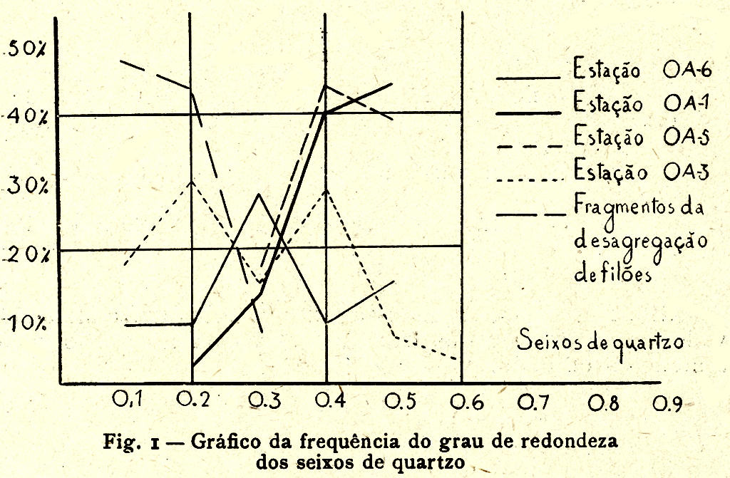 Os valores 0.50 e 0.60 mais frequentes nos seixos de quartzito do que nos de quartzo correspondem a uma forma mais rolada do que os valores 0.1 a 0.4 (mais frequentes nos seixos de quartzo).