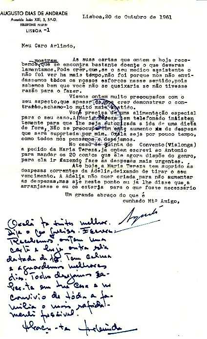 7 - Carta do cunhado Augusto e da irmã Arminda, aquando da detenção de A. Vicente nas masmorras da PIDE em Caxias em 20-10-1961.