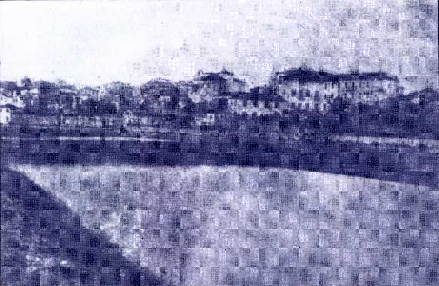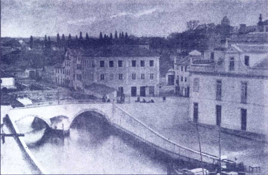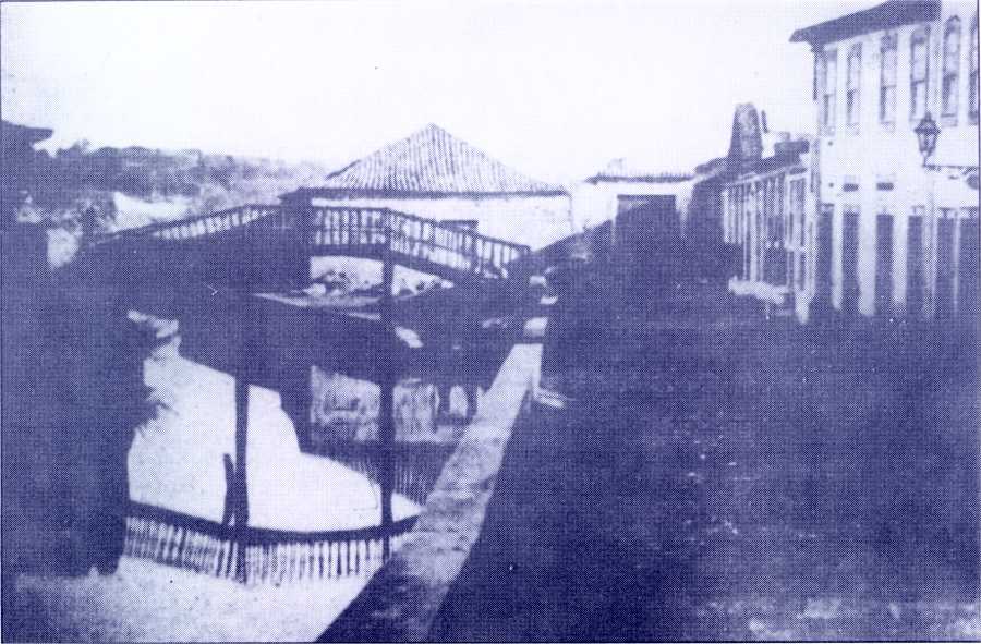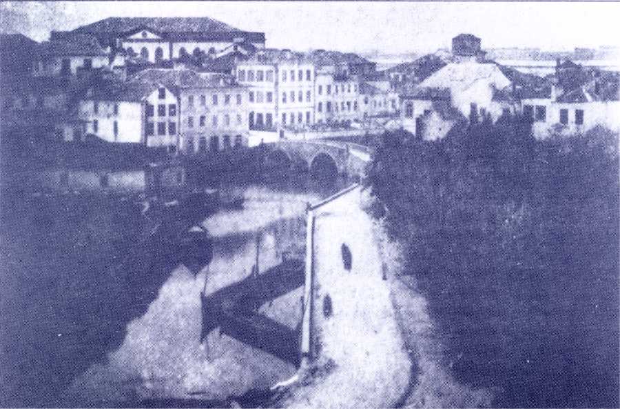 1870 - Vista do antigo "ilhote" e do aqueduto da fonte da Praça ou dos Arcos.