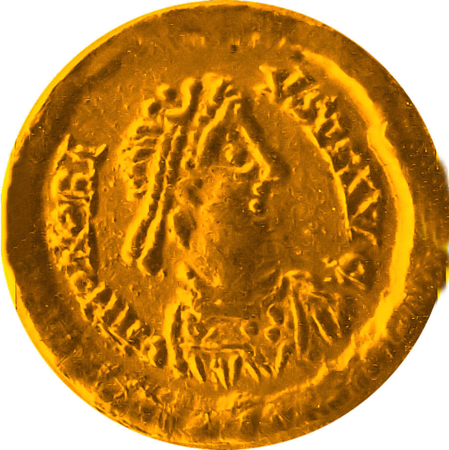 Aparentemente estamos em presença de um soldo do puro do imperador Honório (nascido em 384 e falecido em 423). Com efeito a efígie e as legendas assim o demonstram. As iniciais V S P F referem-se aos votos públicos, concedidos aos imperadores; a letra S pode estar em relação com a palavra suscepta – aceites, ou soluta – cumpridos. Pius – piedoso, e felix – feliz, eram dois dos títulos usados por este imperador. A ideia de Victoria, nesta época, era expressa por uma figura de Imperador esmagando um inimigo ou uma serpente com cabeça humana. Repare-se que na legenda do reverso o A inicial corresponde ao final da palavra VICTORIA.