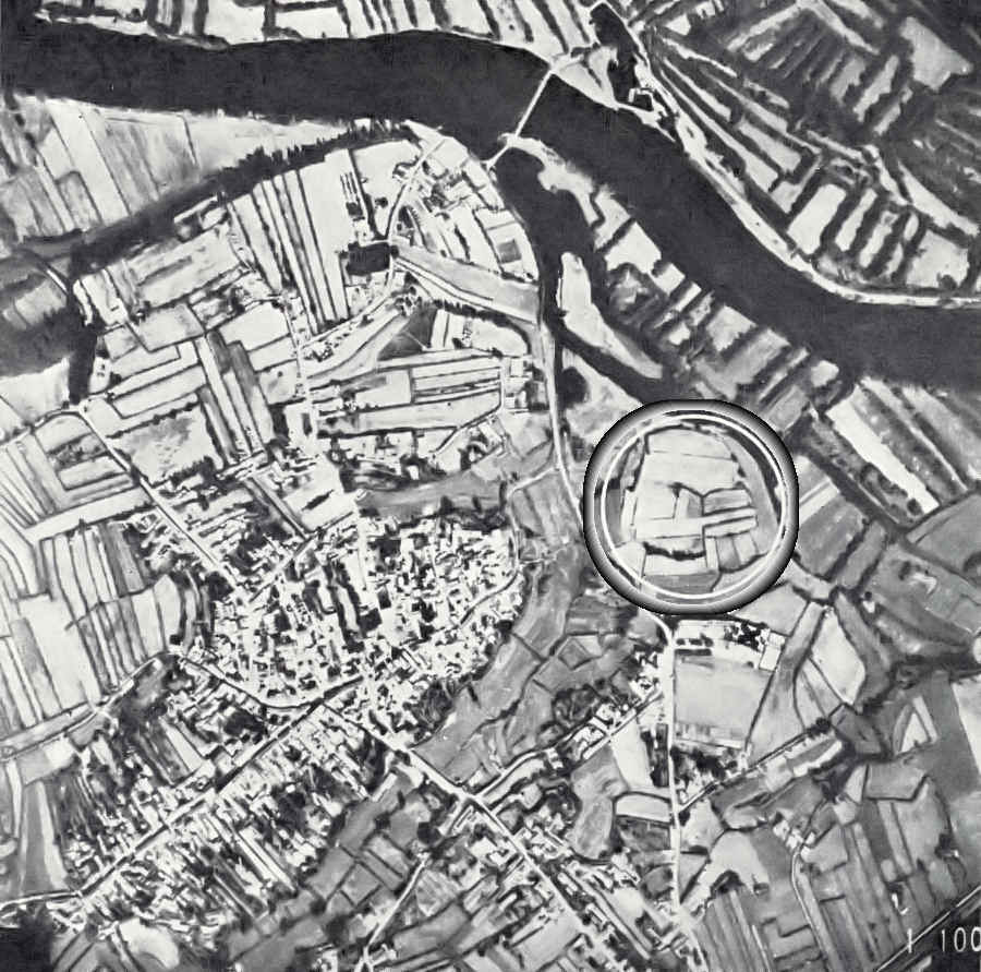 Fotografia aérea, mostrando a localização do rasado outeiro da Torre (no círculo), próximo da igreja matriz de Cacia (x). Também na imagem, o casario da Sarrazola e um trecho do rio Vouga.