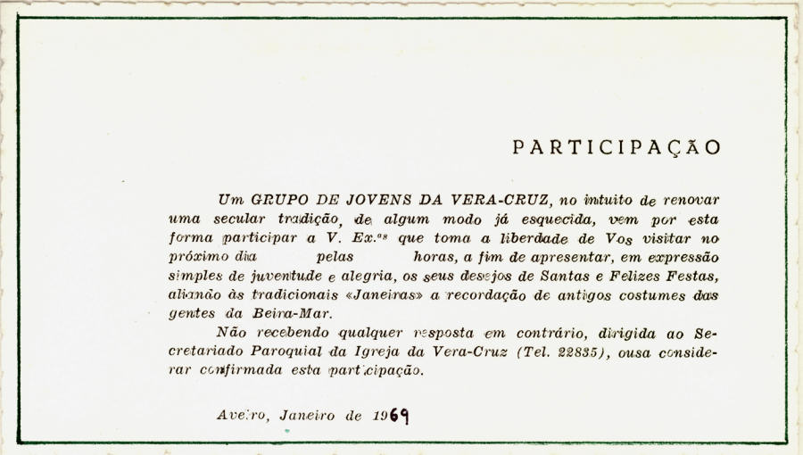 Em finais de Dezembro, é mandada imprimir a PARTICIPAÇÃO dirigida ao Secretariado Paroquial da Igreja da Vera Cruz, na qual se indicam os objectivos do GRUPO DE JOVENS DA VERA CRUZ de renovarem «uma secular tradição, de algum modo já esquecida», como seja a de «apresentar, em expressão simples de juventude e alegria, os seus desejos de Santas e Felizes Festas, aliando às tradicionais «Janeiras» a recordação de antigos costumes das gentes da Beira-Mar».