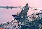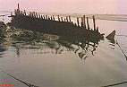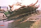 Carcassa apodrecida da fragata a ser puxada para a carreira dos estaleiros Ria-Marine.