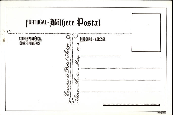 13.SN. Reprodução da ADERAV de postais antigos, Março de 1984. Aveiro, Chafariz do Espírito Santo. Dim. 148x100 mm. Col. J.L.Christo.Verso   14.SN. Reprodução da ADERAV de postais antigos, Março de 1984. Aveiro, N.º 210. Aveiro-Rua da Custeira. Dim. 148x100 mm. Col. J.L.Christo.Verso   15.N.º 4. Aveiro. Vista geral tirada de Hidro. Ed. SOUTO, Tip. da Sociedade de Papelaria, Lda, Porto. SD. Dim. 93x140 mm. Col. J.L.Christo. Verso   16.N.º 11. Aveiro.Gafanha, Seca do Bacalhau. Ed. SOUTO, Tip. da Sociedade de Papelaria, Lda, Porto. SD. Dim. 93x140 mm. Col. J.L.Christo. Verso