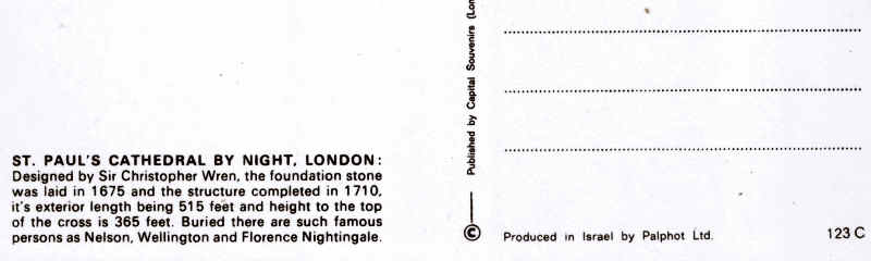 N.º 123 C - LONDON - ST. PAUL'S CATHEDRAL BY NIGHT - Ed. CAPITAL SOUVENIRS (London) Ltd. 8 Shorts Gardens WC 2 836 2572/2382 Produced in Israel by Palphot Ltd. - SD - Dim. 14,9x10,4 cm - Col. Manuel Bóia (1986)